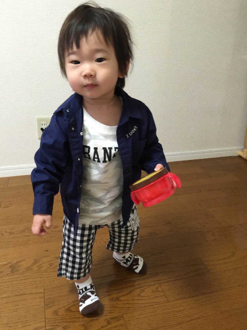 AZULとしまむらのコラボのTシャツをインに。 お下がりで90サイズのボトムをたくさんもらったので今年の夏はフル活用しようと思う٩( 'ω' )و