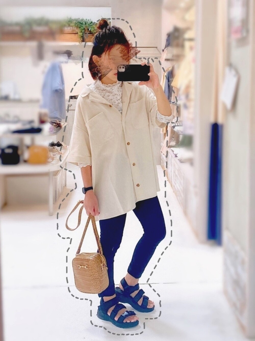シンプルに可愛いオーバーサイズの開襟リネンシャツGET♡ 色に悩み過ぎて休憩のご飯食べる時間が5分しかなくなった悲しい思い出…(笑) 結果、絞れなくてアイボリーとライトカーキ買うよね_(:3」z)_ インナーにレースの7分袖のレースを持ってきてみた♬