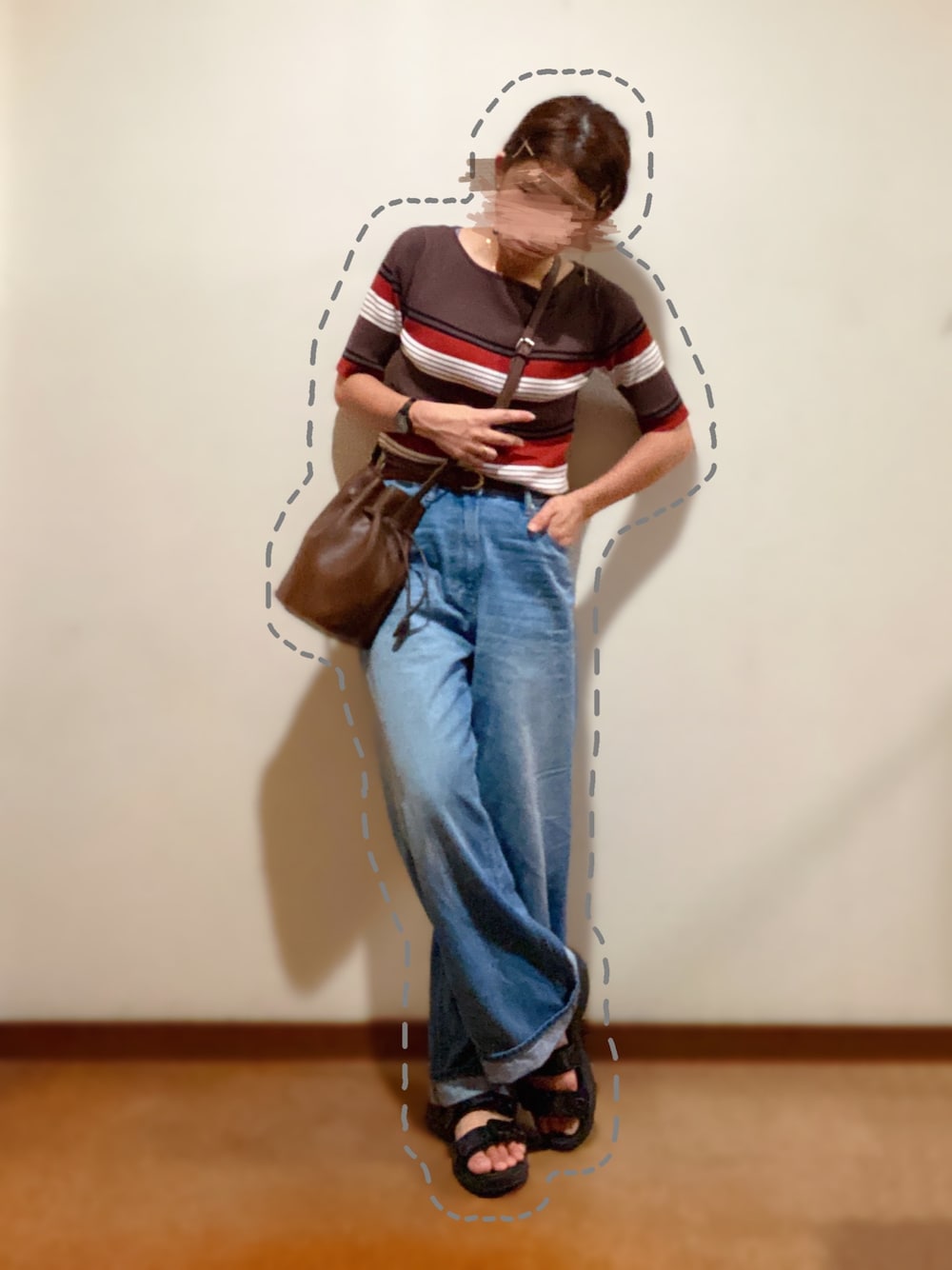 ボーダーリブニット×ワイドのデニムパンツ合わせ♡ 定番スタイルかな、うん🤔 このパンツのダルっとしたゆるいシルエットがお気に入り🥳 実は全身驚異のプチプラ😂w