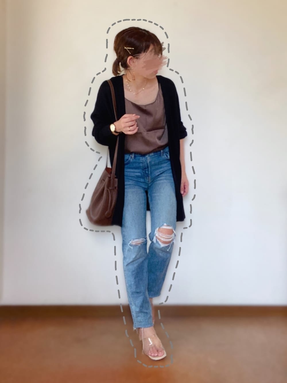 サテンキャミソール+ダメージデニム合わせ♡ 至ってシンプルだけどサテンキャミがポイント😘 カーディガンも畦編みだからそこまで暑くなくて気軽に着れる♬