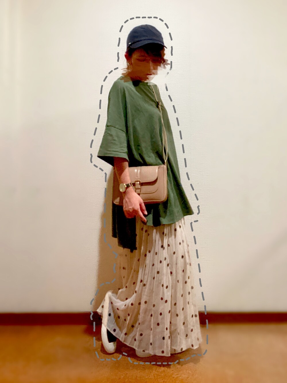 ヘムカットBIG T×水玉スカート合わせ♡ キャップとスニーカー、カーキのトップスでよりカジュアルに見える🙄☝️ そこにきれい目ミニバッグがアクセント🤗💕