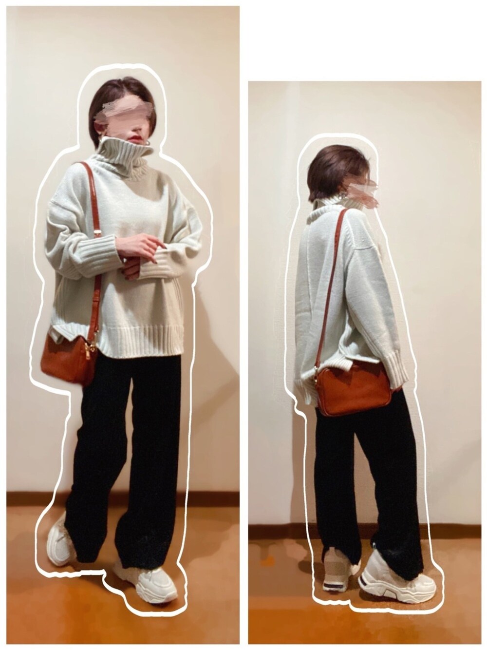 ざっくり白ニット×ベロアパンツ合わせ♡ 今年っぽいざっくりのタートルニット🤗 タートル伸ばしても可愛い🤝💕 ダマスク柄のベロアパンツをメインにカラーは少なめシンプルコーデ😎🎶