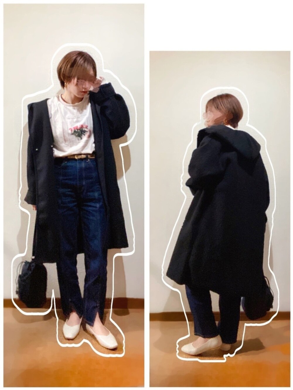 カジュアルコート×センタースリットデニムパンツ合わせ♡ フォトロンTとフード付きのコートでカジュアルだけど濃いめのデニムパンツとフラットパンプスで綺麗めをプラス☺️✨ GUのデニムパンツ、センターのスリットがアクセントになってありがたい🥺🙏 皆さんにとって良い年越しとなりますように☺️