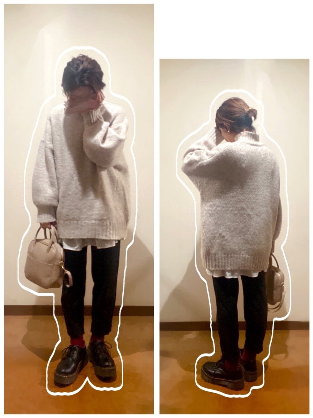 ゆるニット×テーパードパンツ合わせ♡ 黒のテーパードパンツにカラーソックス見せのマニッシュシューズで合わせて男の子っぽく🙋♂️ けどゆるニットでガーリーさもプラスです☝️💕