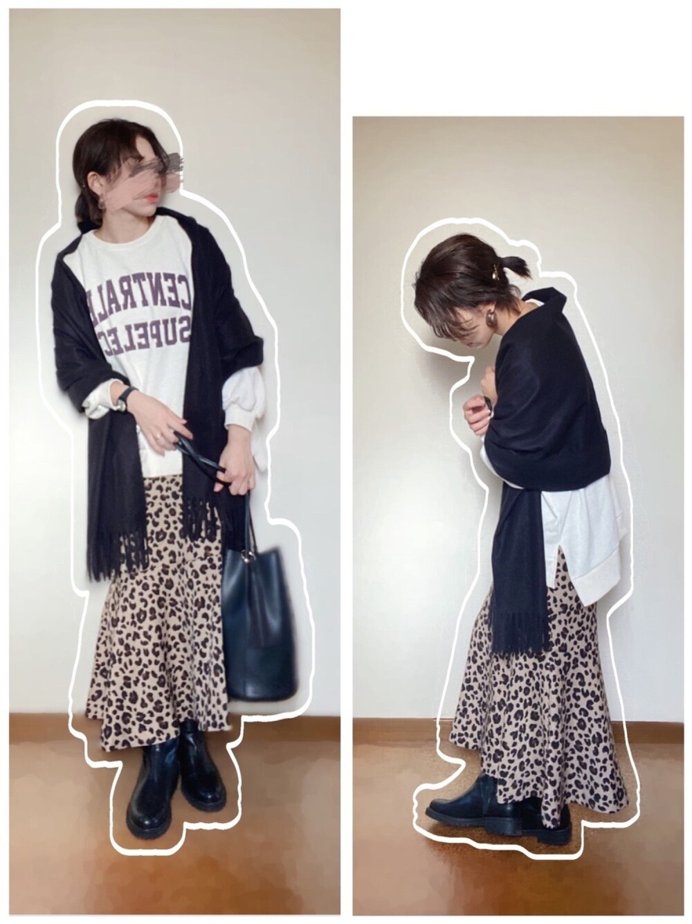 カレッジロゴトレーナー×マーメイドスカート合わせ♡ カジュアル代表のロゴトレーナーにレオパードのマーメイドスカートを合わせて大人カジュアルに😘 マフラーも暖かいこの時期には肩掛けに良いですよね♬