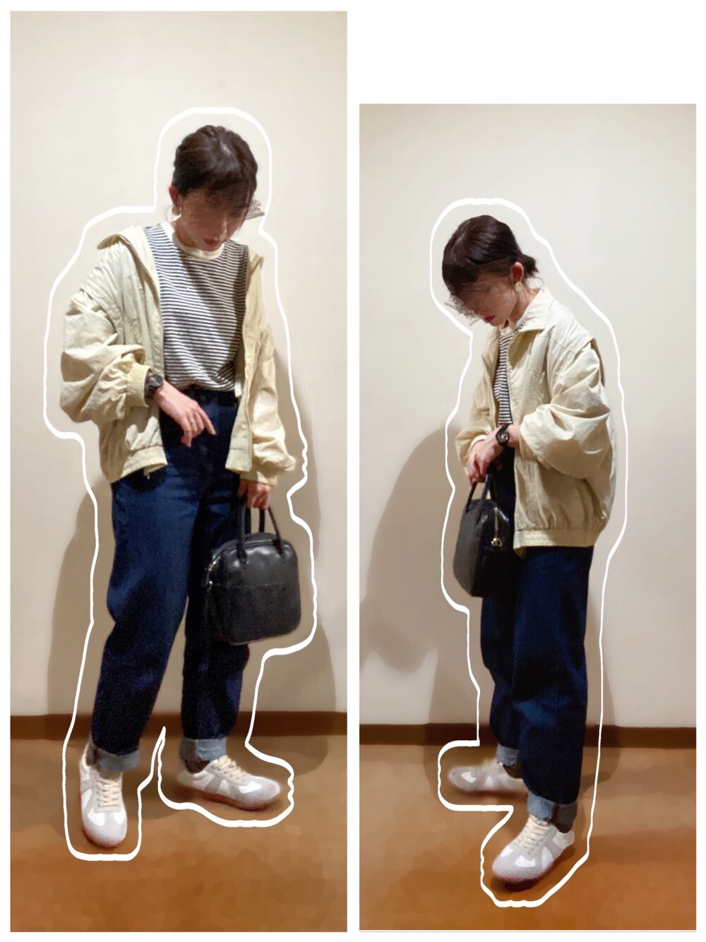 ブルゾンジャケット×マムデニム合わせ♡ シャカシャカのブルゾンにデニムを合わせて王道のカジュアルコーデ🥳 モノトーンのボーダーTをポイントに☝️💕