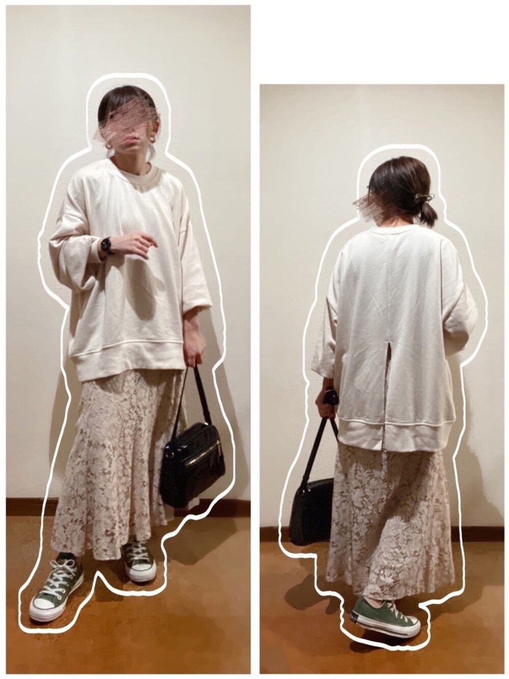 スウェット×総レーススカート合わせ♡ カジュアルなトップスにマーメイドスカートを合わせるのってマーメイドスカート初心者でも取り入れやすく簡単に女性らしい大人カジュアルになりますよね🥳💕 ていうか、しまむらでこんなスカートが買えるなんて神過ぎますね😂👏✨