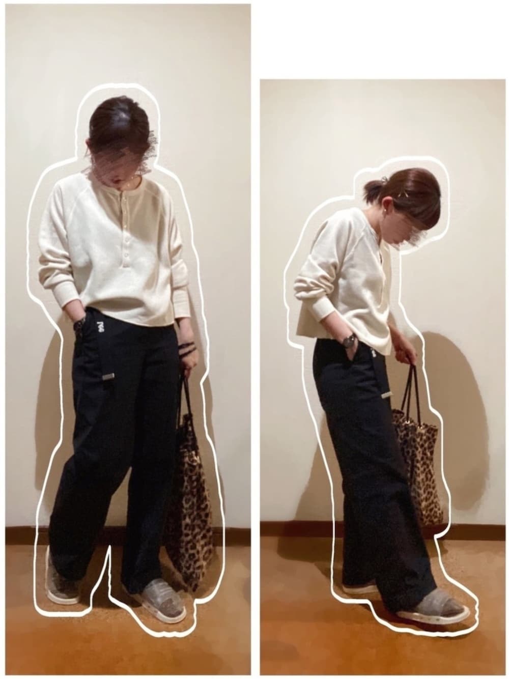 ショート丈トップス×メンズっぽカジュアルパンツ合わせ♡ しっかり目の記事でメンズ感強めなシルエットがお気に入りのボトムスにショート丈のトップスでバランスをとってみました🤔✨ スニーカーを履いていたけど、仕事終わりのスーパーにはスリッパに履き替えました〜🤗 スリコのシャワーサンダルがまさかの可愛すぎるる、、😂💕