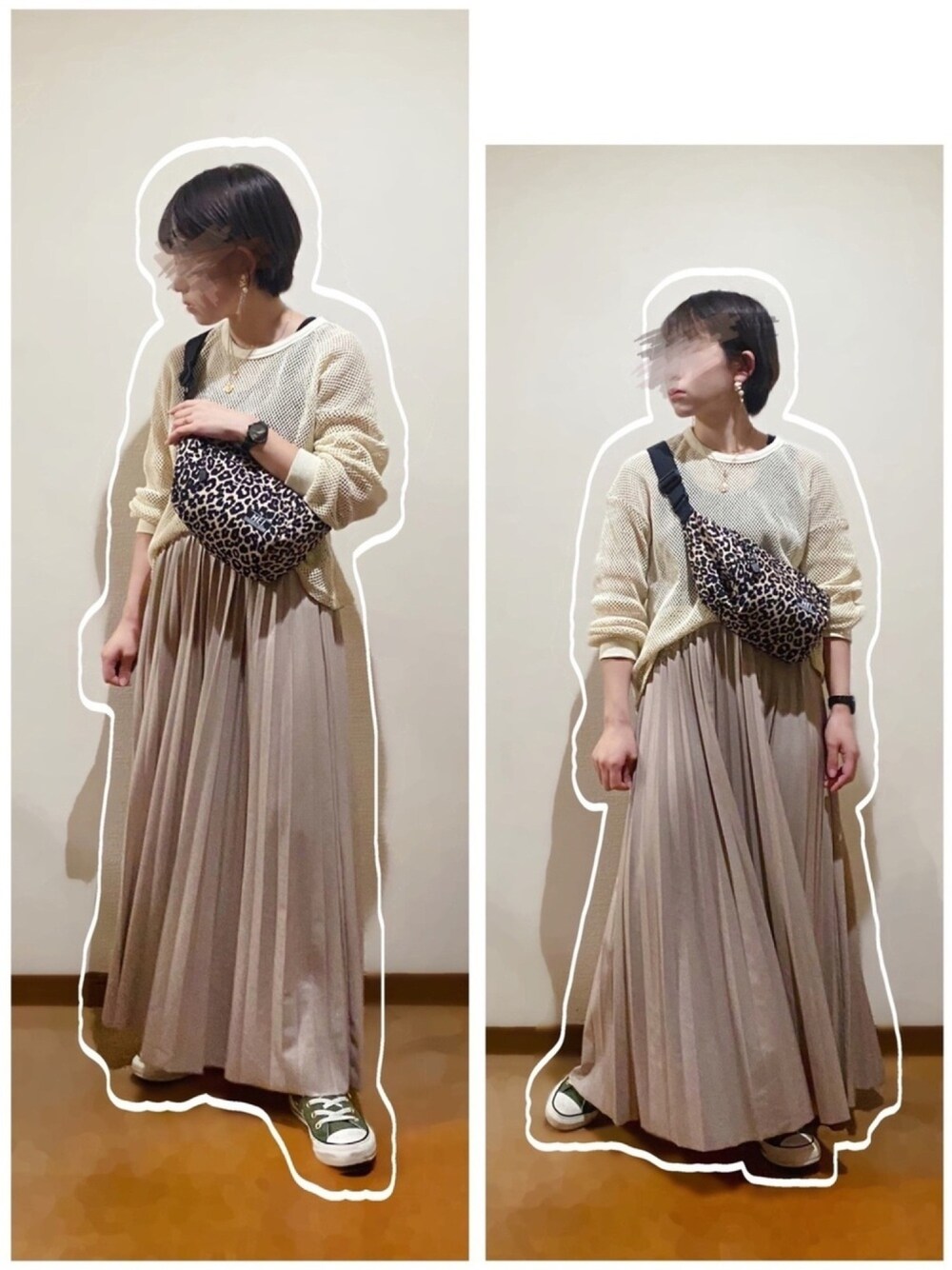 メッシュトップス×レザープリーツスカート合わせ♡ メッシュとレザーの組み合わせくどく見えないようにワントーンでシンプルコーデ💁♀️✨