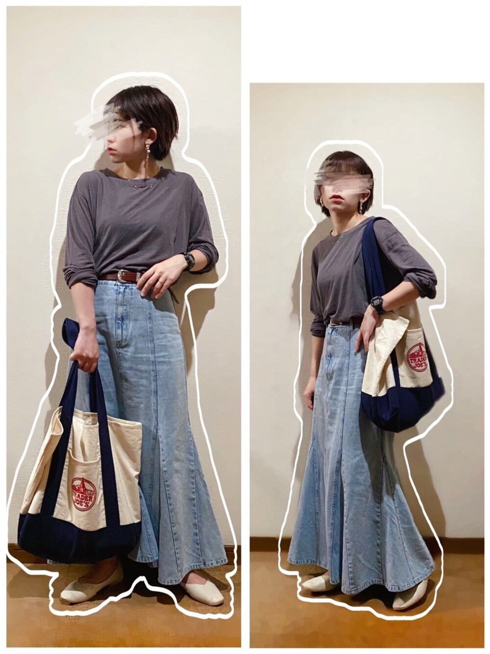 シアーロンT×デニムスカート合わせ♡ 今日も、どカジュアル😎笑 裾のフレア具合が大好きなスカート💕 大きなトートバッグがポイントです🍇🍋🍎