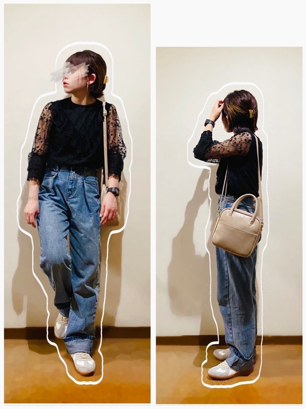 総レースブラウス×タックデニムパンツ合わせ♡ ガーリーな袖シースルーのレースブラウスにゆるっとデニムのワイドパンツを合わせてカジュアルに💁♀️♬