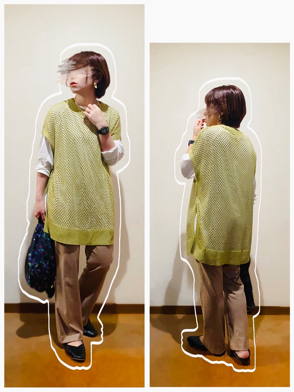 メッシュニットベスト×セミフレアパンツ合わせ♡ グリーンの色味が綺麗なニットベストをGET♬ 黒とすっごい悩んだけど、、🤔