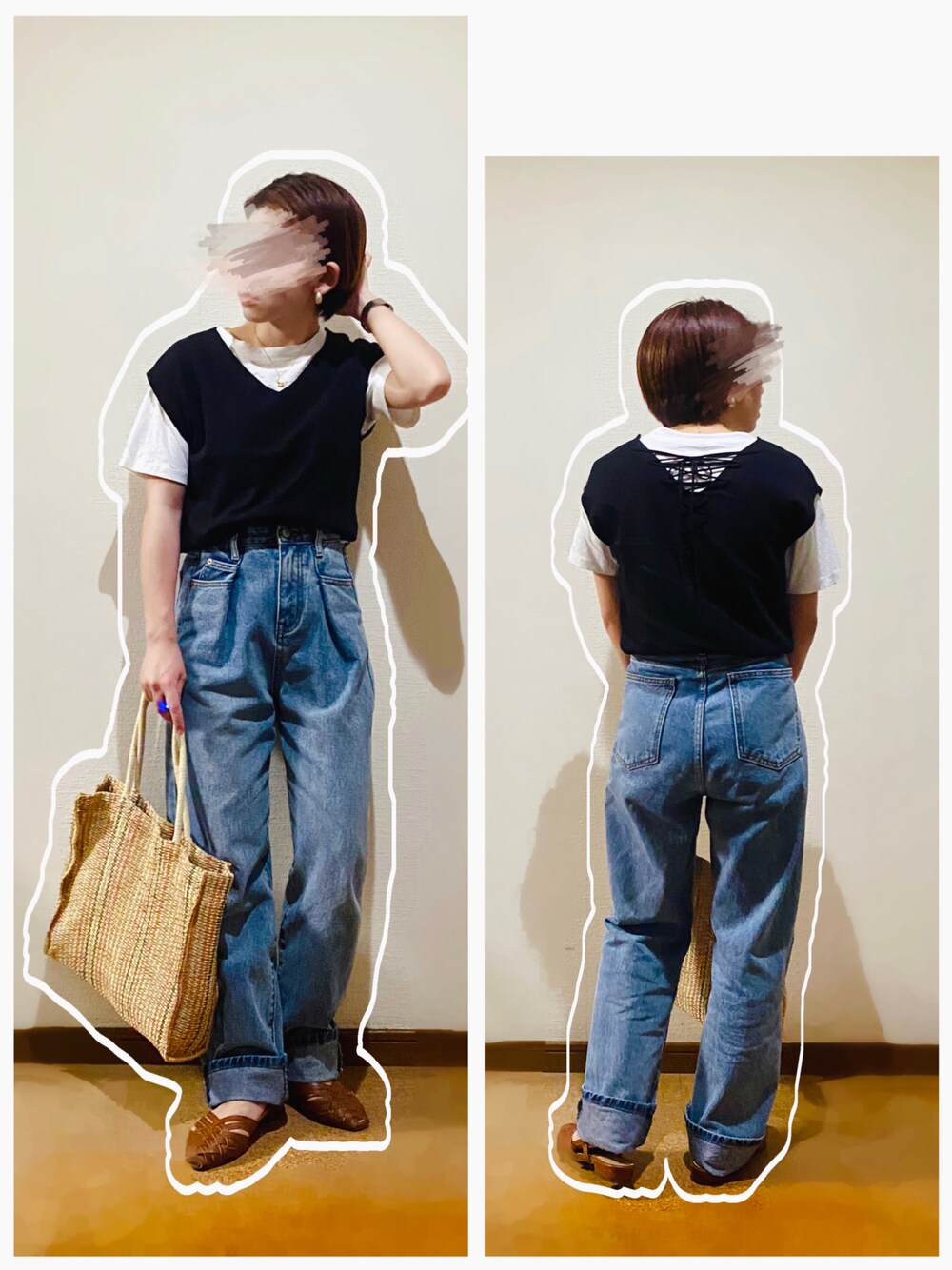 レースアップニットベスト×ワイドデニムパンツ合わせ♡