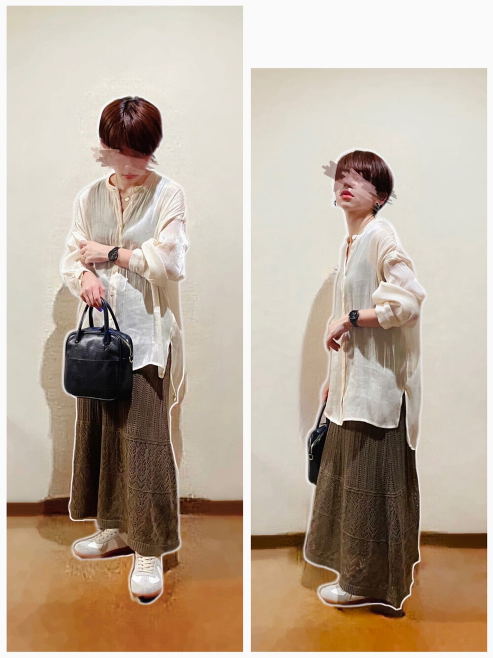 シャイニーブラウス×鍵編みニットスカート合わせ♡