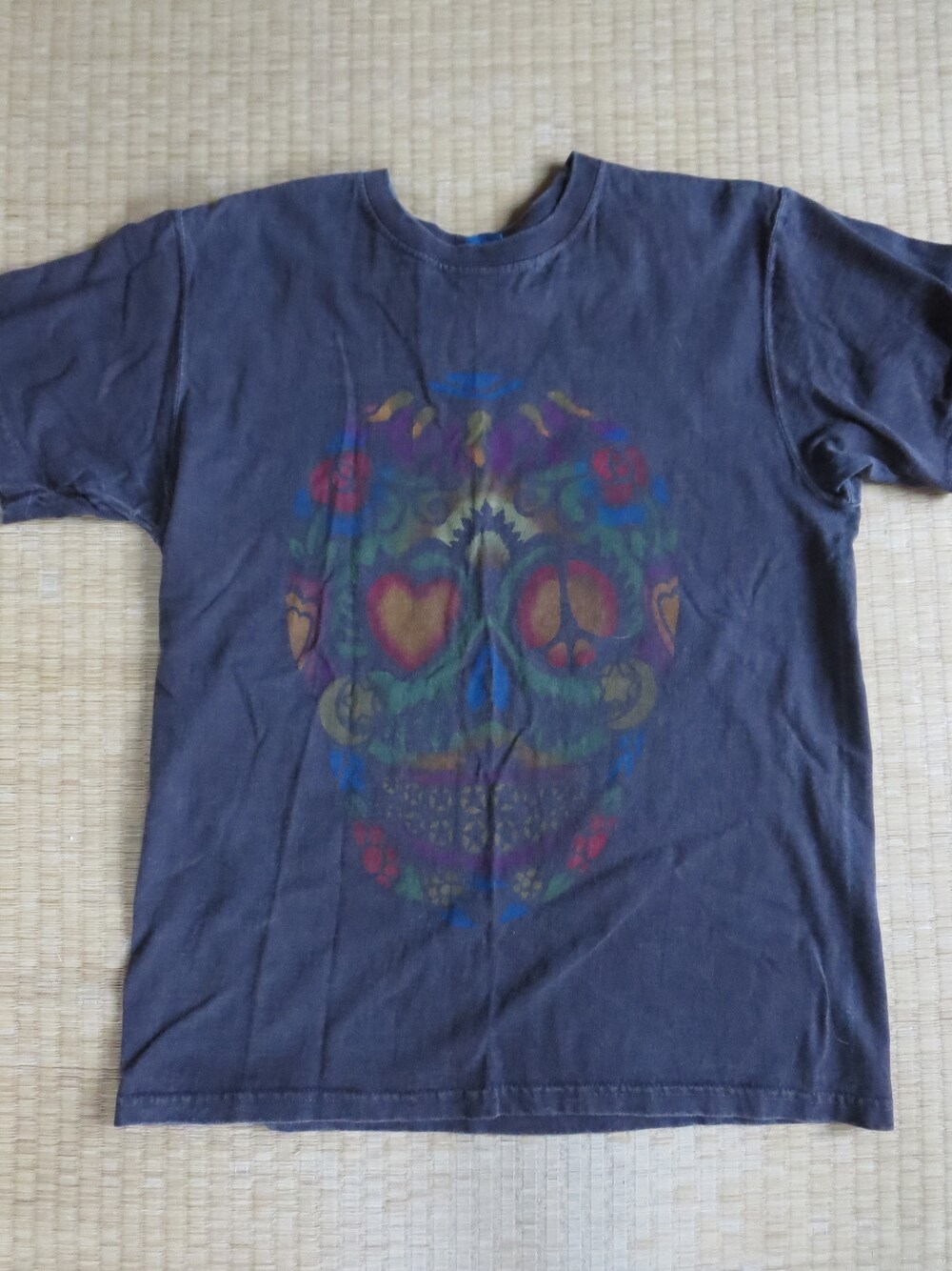 四年前くらいに買ったTシャツです ハッピーな模様のドクロシャツ。 結構気に入っているんです なんか生地も分厚くて。 気持ちいい感じにまとえます。