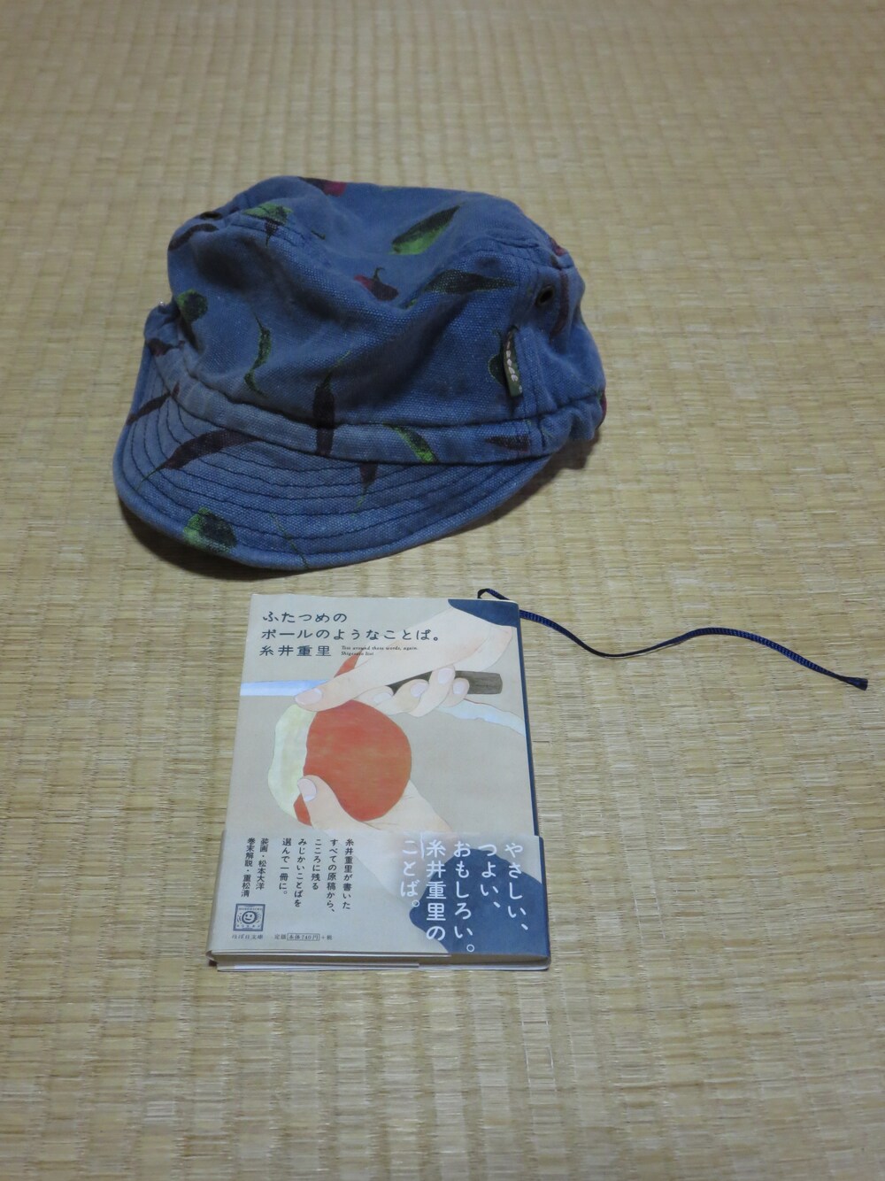 最近のお供 愛用の帽子と この頃の道の手順「ふたつめのボールのようなことば」糸井重里。 この帽子色あせてる 5年くらい被ってる。 唐辛子柄です。 アウトドアです。 太陽に照らされて いい感じにへなへなに。 この本 本当に自分に自分を最近道筋を手助けしてくれて いいんです。軽く緩やかで 丁寧に 手を取ってくれる。 糸井重里さんはすごいね パラパラ読めるのでお薦めです。
