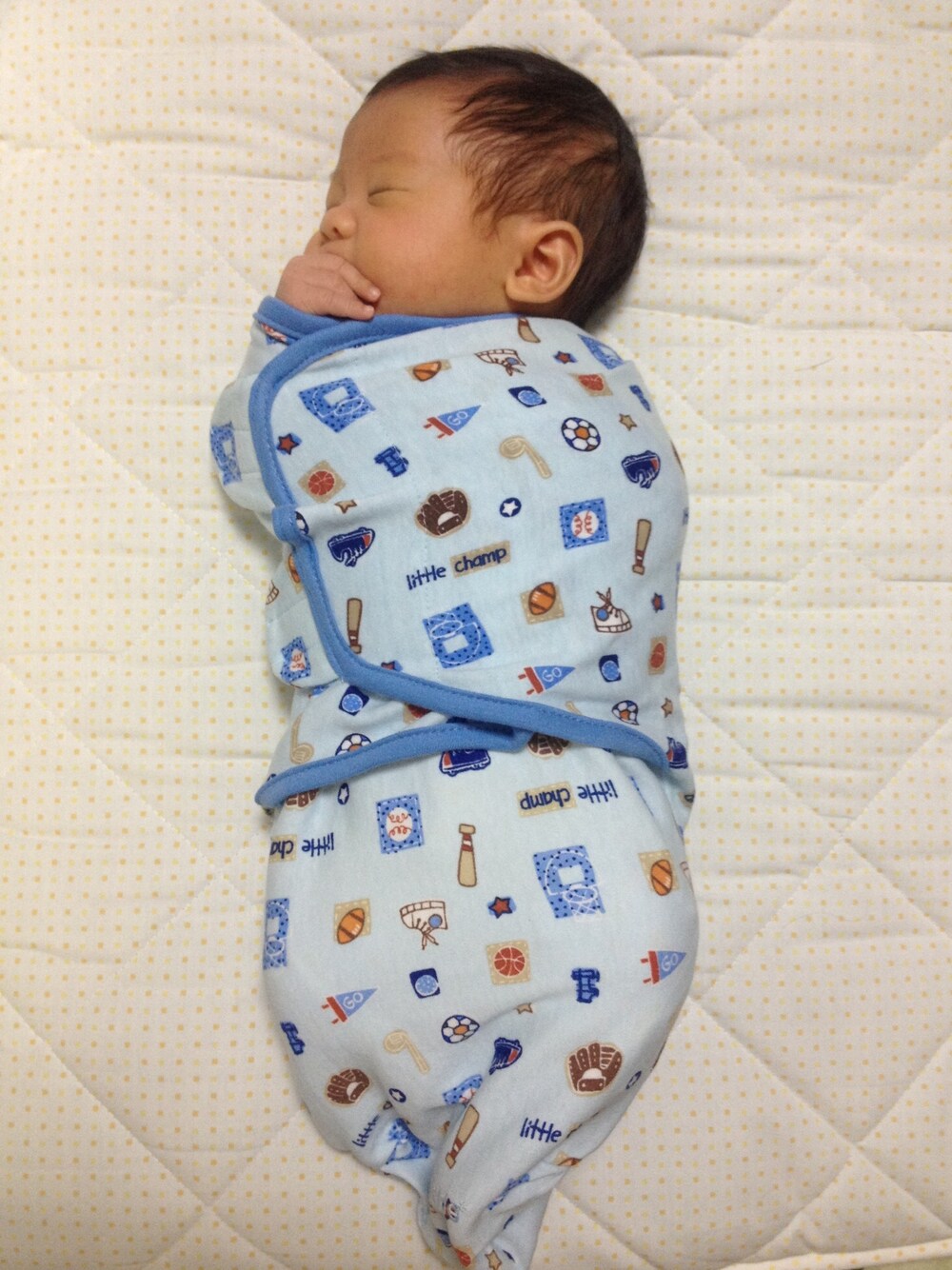 1ヶ月の頃 母にプレゼントしてもらったスワドルミー. が、しかし、息子『ぐぐぐ』と、すぐに手出しちゃう。。束縛が嫌いな様子。