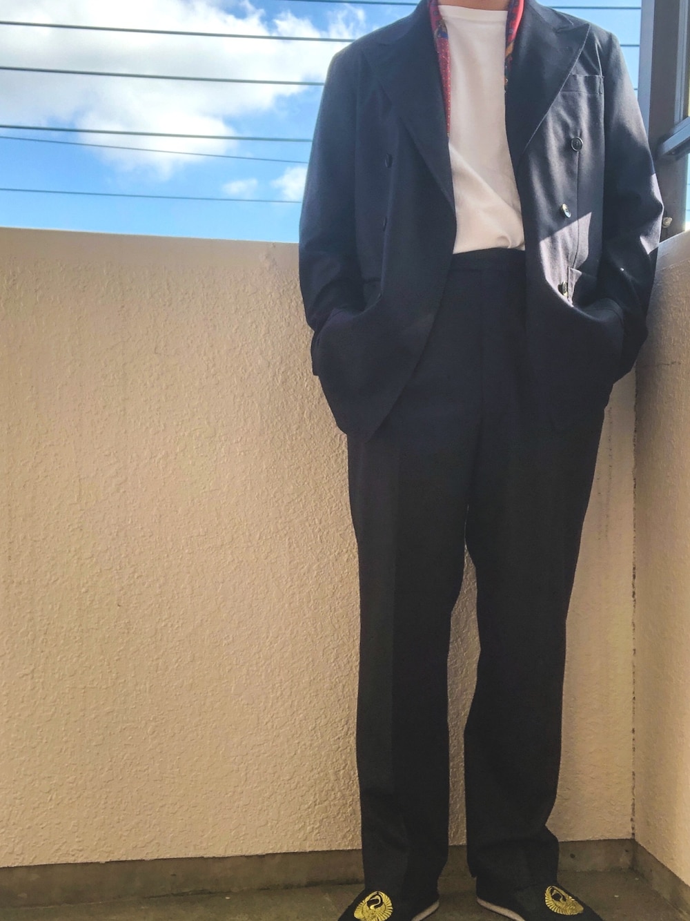 オンオフ関係なく使えるLe'choopeのオリジナルLEのダブルのセットアップを軸にコーデ。 程よい抜け感とエレガンスをミックス。