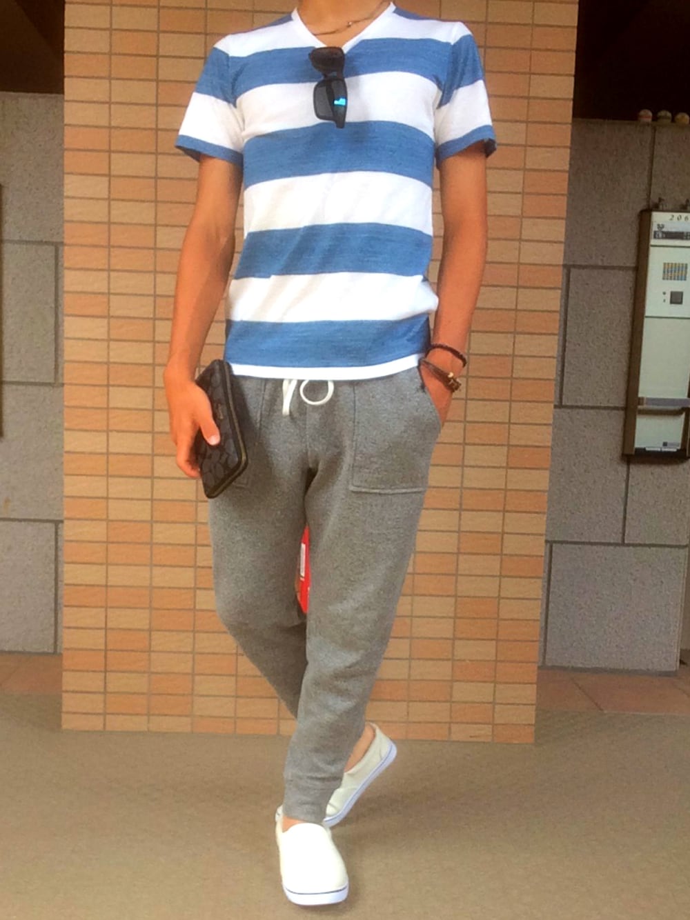 本日2枚目です♩ 自分は休日コーデとして着ています。 ・ Tシャツはボーダー柄が太いものにしました。自分のボーダーの使い分けとしては、太く粗いほどリラックスした休日っぽくなり、細くてくっきりしてるほど街向けといった感じです。チェック柄も同様です。 ・ GUのスウェットとてもいいです!1番嬉しかったのが2000円という安価なところです。本当はロンハーマンのスウェットとかに憧れてる私なんですが、高校生には金銭的に全く手の届かない位置にあるので、これでなんとか着こなしてる感じです。 ・ ぜひイイねお願いします🙇