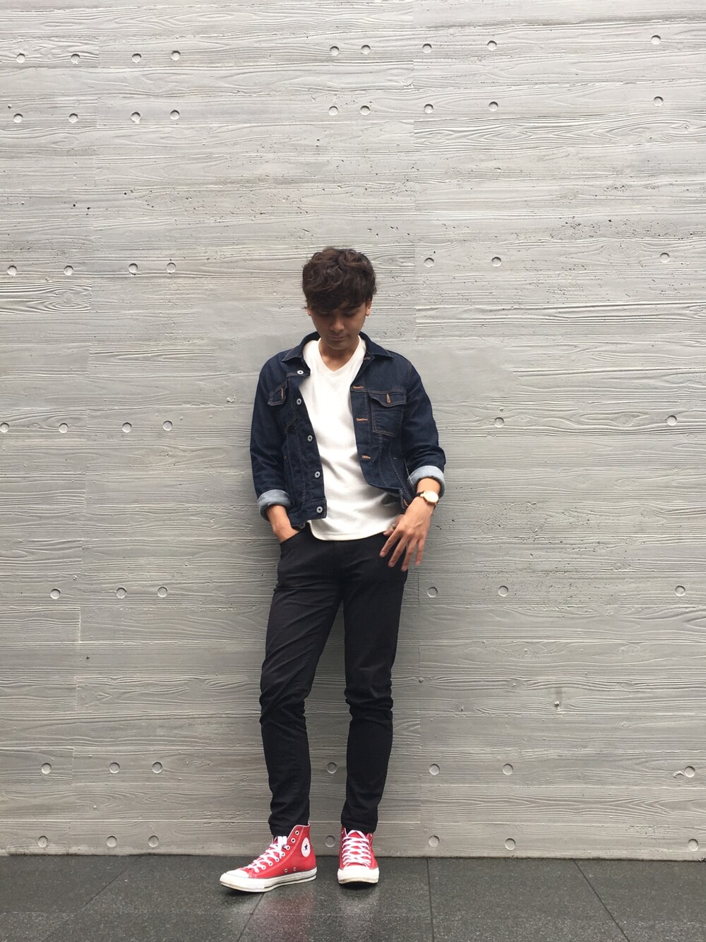 デニムジャケットに赤のコンバース かわいすぎですね。