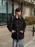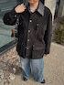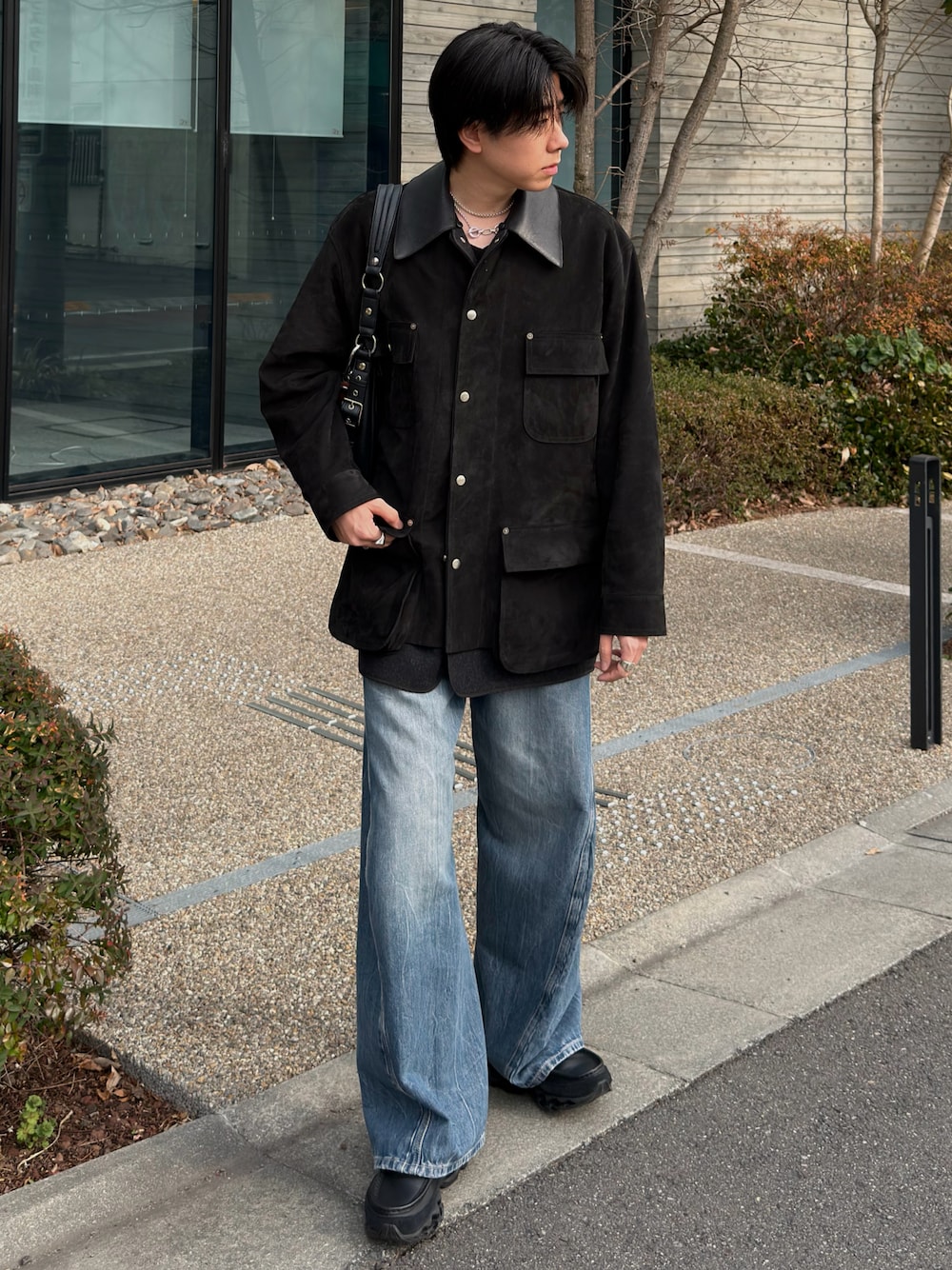 黒のスエードジャケットを主役に、色落ちしたワイドデニムを合わせたキレイ目カジュアルスタイル。 襟元のレザー切り替えや上品なシルバーアクセが、無骨になりがちなワーク調アイテムを洗練された大人の着こなしへと昇華しています。