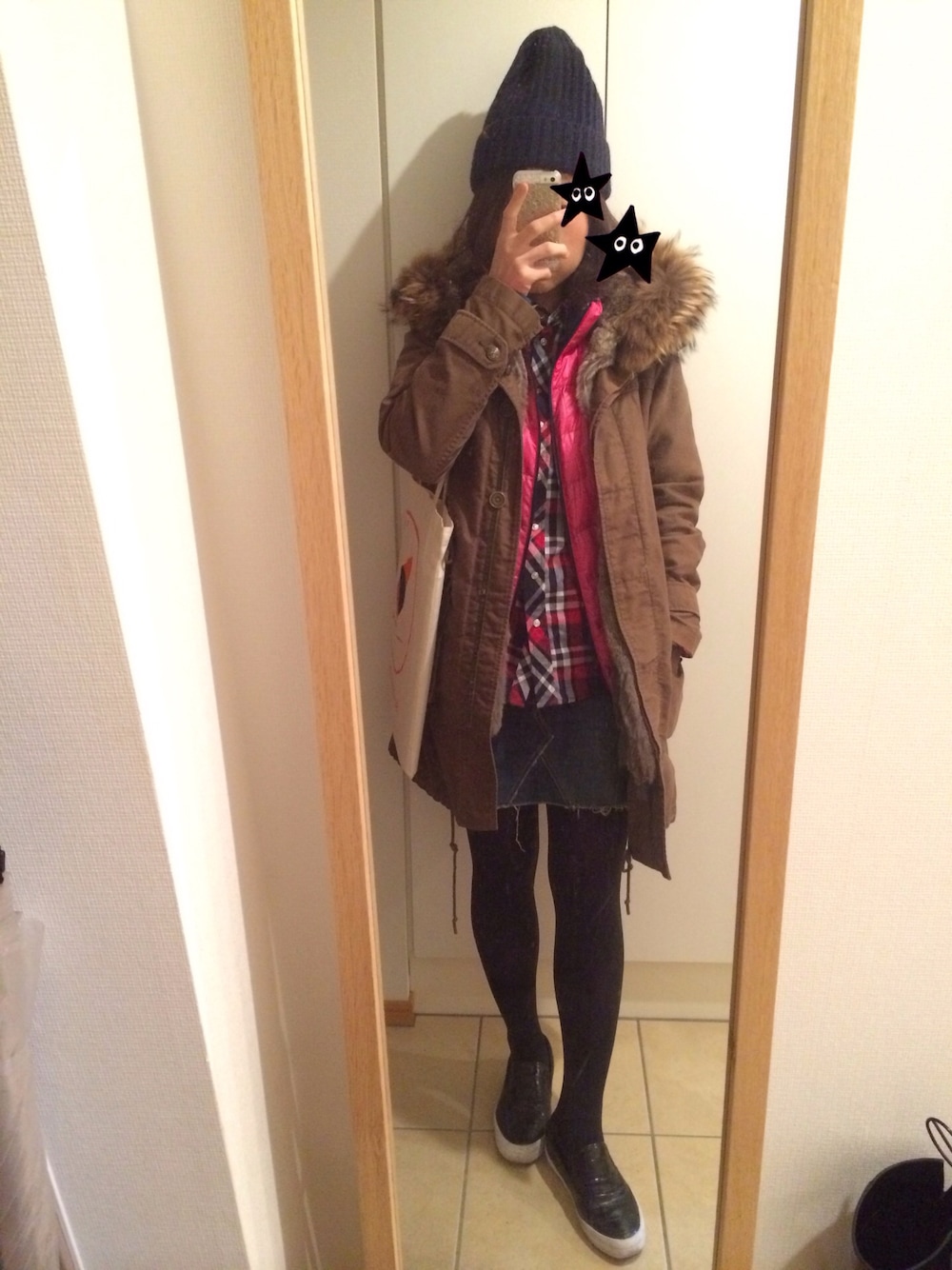 ダウンジャケット:PUMA モッズコート:ブランド不明 トートバッグ:SUNDRY(ノベルティ)