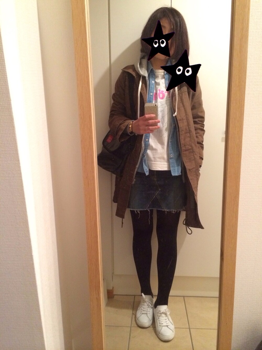 モッズコート:ブランド不明 パーカー:無印良品 Tシャツ:RNA