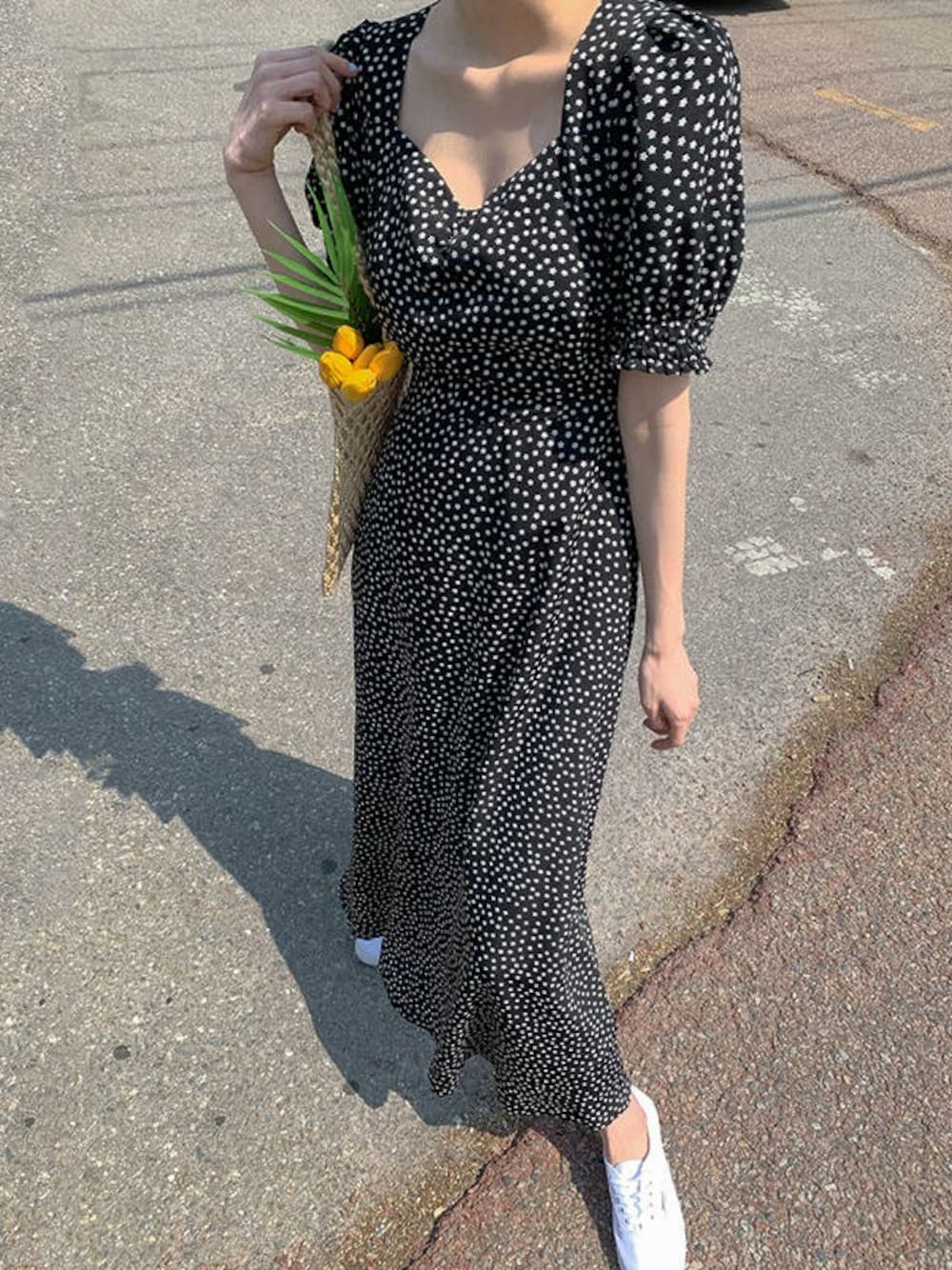 Syareher_officialのワンピース「美感いっぱいエレガントフランスオシャレドット柄ロングカジュアルワンピース」を使ったコーディネート