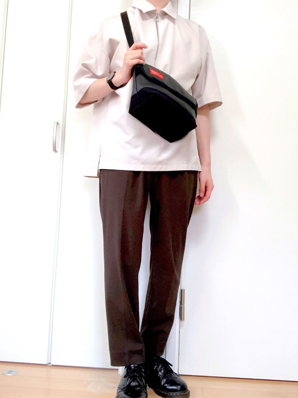 今日はシャツ1枚のシンプルコーデです☀️ シャツにパンツも合わせてブラウンにまとめてみました! 適度なオーバーサイズとハーフジップがついてることでキチッとしすぎないのがポイントです! バッグも少し光沢のあるデザインがお気に入りです⭐️