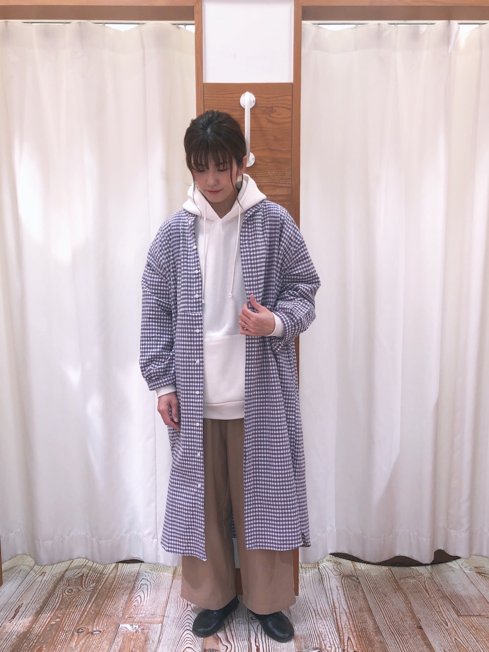 前回のパーカーを使った着回しです! パーカーの上からバンドカラーシャツワンピースを羽織りました! カジュアル感を出しすぎないように、パンツはストレートパンツを選んでいます♪