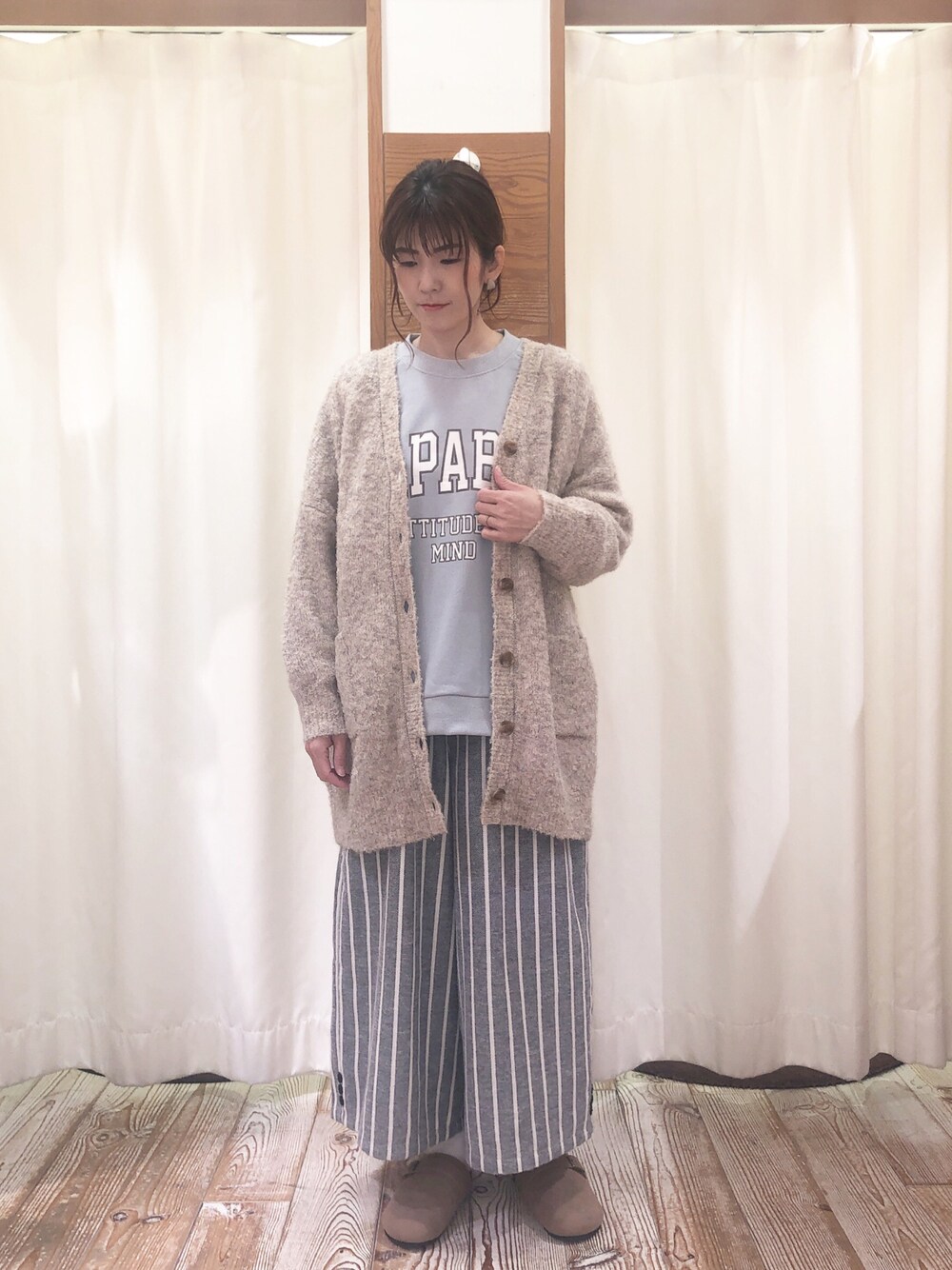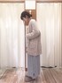 前回のスウェットの着回しです! ワイドパンツとブークレのゆるいカーディガンでスウェットのカジュアル感をダウン!
