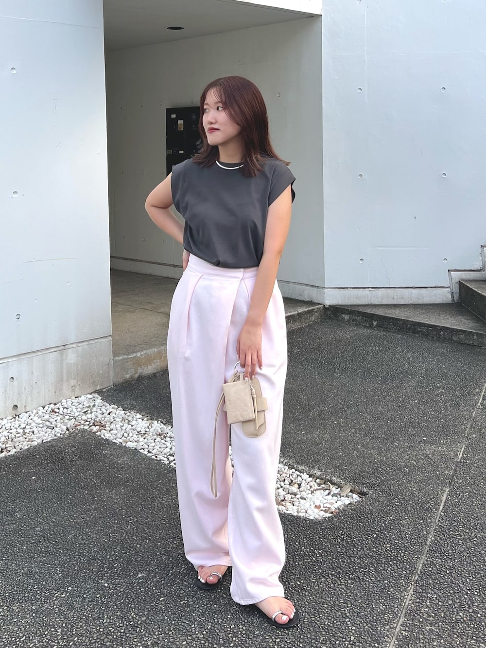 《tops》 肩のタックが華奢見えするノースリカットソー。シャリ感のある素材で柔らかく着心地が良い1枚です。ボトムを選ばず幅広くスタイリングを楽しめます。 《pants》着用38サイズ ウエストのラップデザインがポイントのデニムパンツ。程よいワイドシルエットでゆるっとラフに使えます。深みのあるブラウンでカラー合わせもしやすいです。