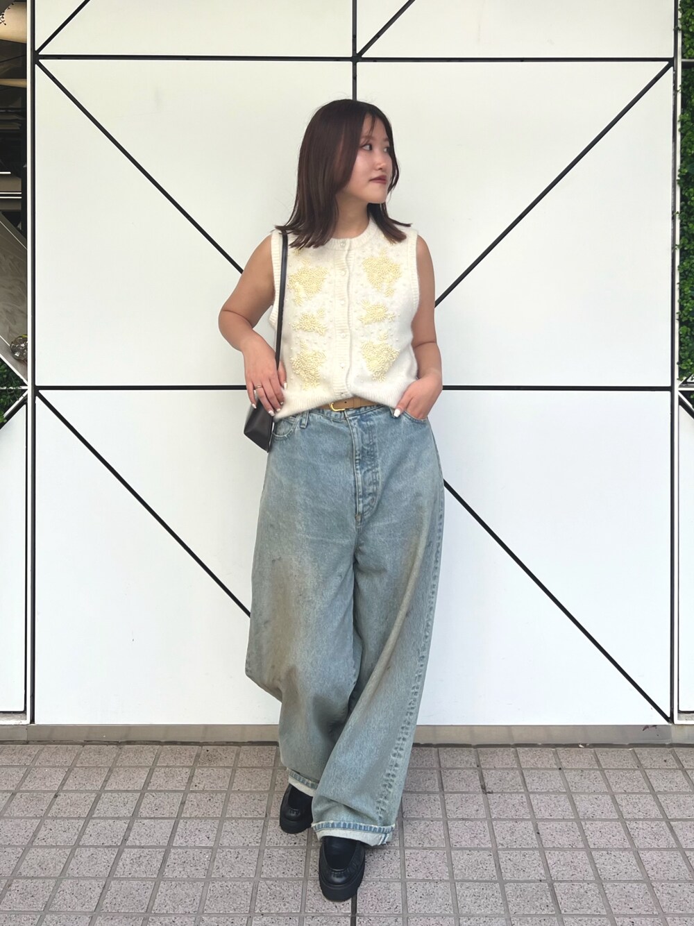 《tops》 ビーズニットジレ。コンパクトなサイズ感でボトムを選ばずお使いいただけます。チクチク感のない肌触りの良いニットです。 《pants》着用38サイズ ワイドデニムパンツ。ヴィンテージ加工のような風合いで他にはないデニムです。ワイドなシルエットなのでトップスや小物は華奢なアイテムがおすすめです。