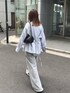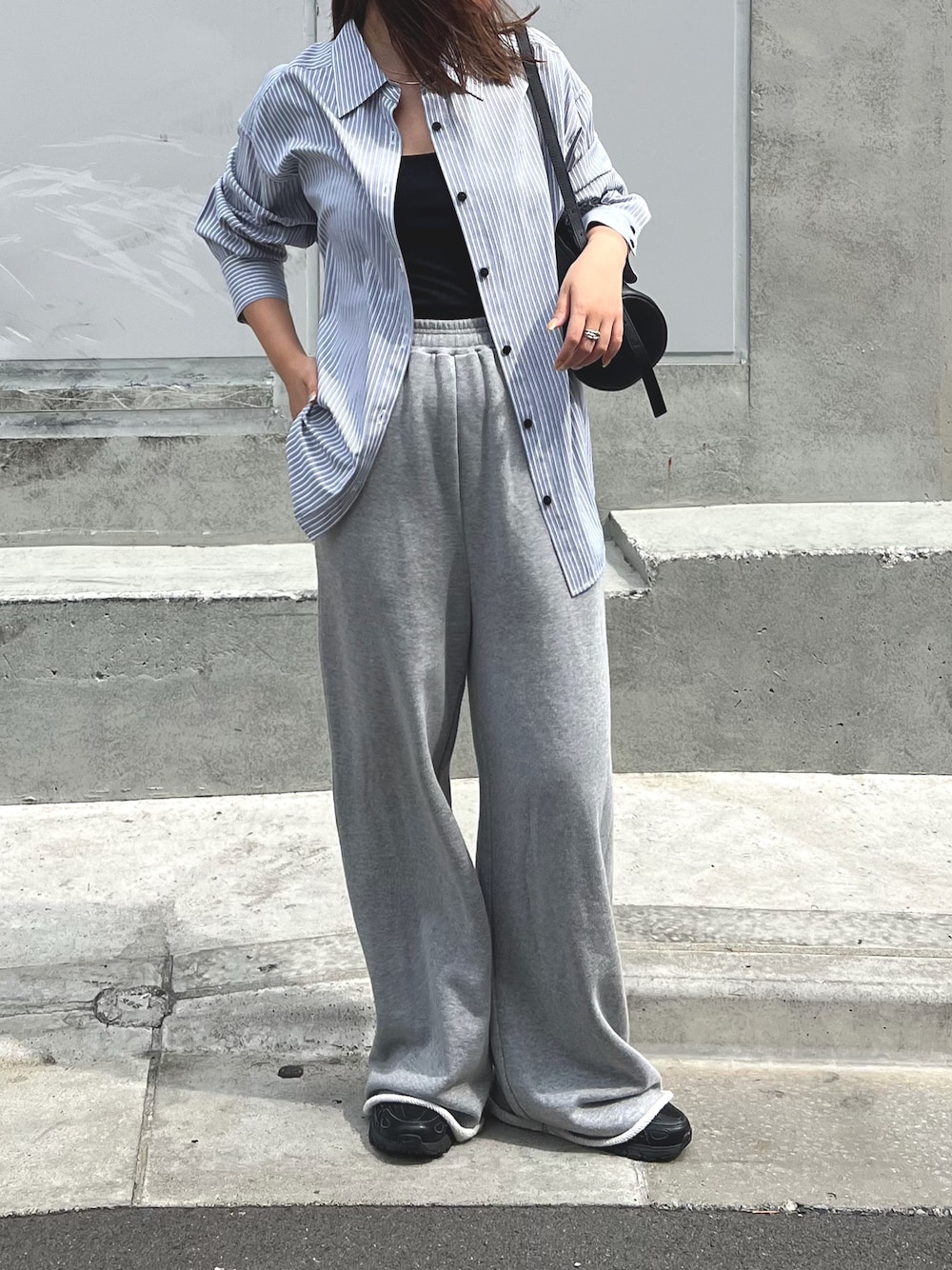 《shirt》 着回し力抜群のストライプシャツ。レースアップ仕様の後ろの紐を前でウエストマークしたりとシルエットを変えて楽しめます!ニットのインナーにもおすすめです。 《pants》 大人のスウェットパンツ。薄手で落ち感があり裾の切りっぱなしがカジュアルになり過ぎないデザインです。ヒールを合わせてきれいめスタイルもおすすめです!