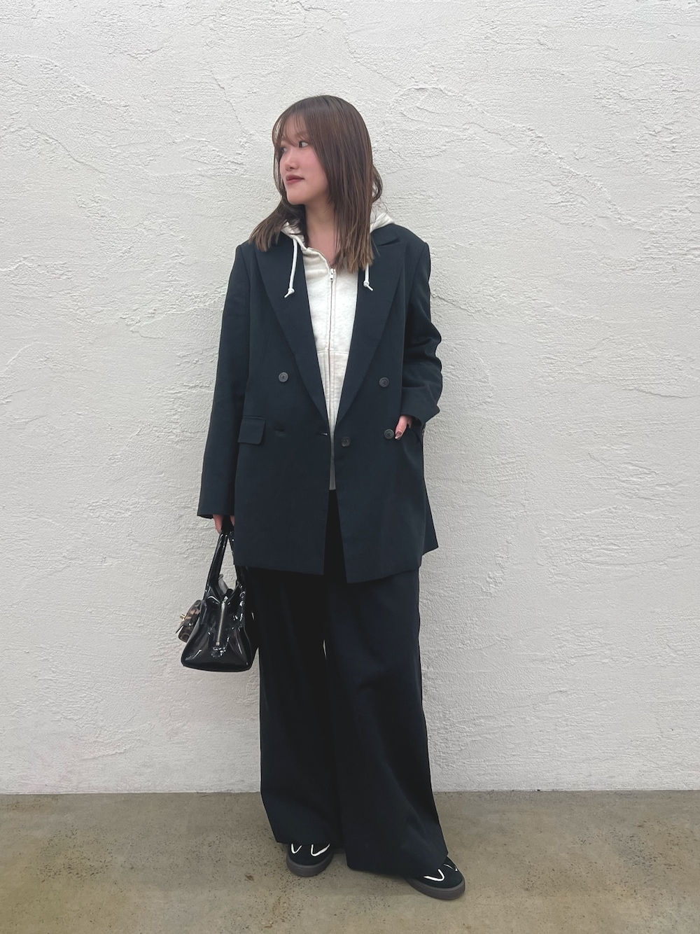 《jacket》 綿麻ダブルジャケット。ハリのあるドライタッチな素材で軽い着心地です。同素材のワイドパンツとセットアップもおすすめです。 《tops》 ロゴ刺繍ジップパーカー。コンパクトでジャケットのインナーにも使いやすいサイズ感です。フードの立体感もポイントです。 《pants》着用38サイズ 綿麻ワイドパンツ。ハリのあるドライタッチな素材で軽い着心地です。タックが腰回りをすっきり見せてくれるのでインスタイルにもおすすめです。シンプルなデザインで合わせやすく、着回しの効くアイテムです。