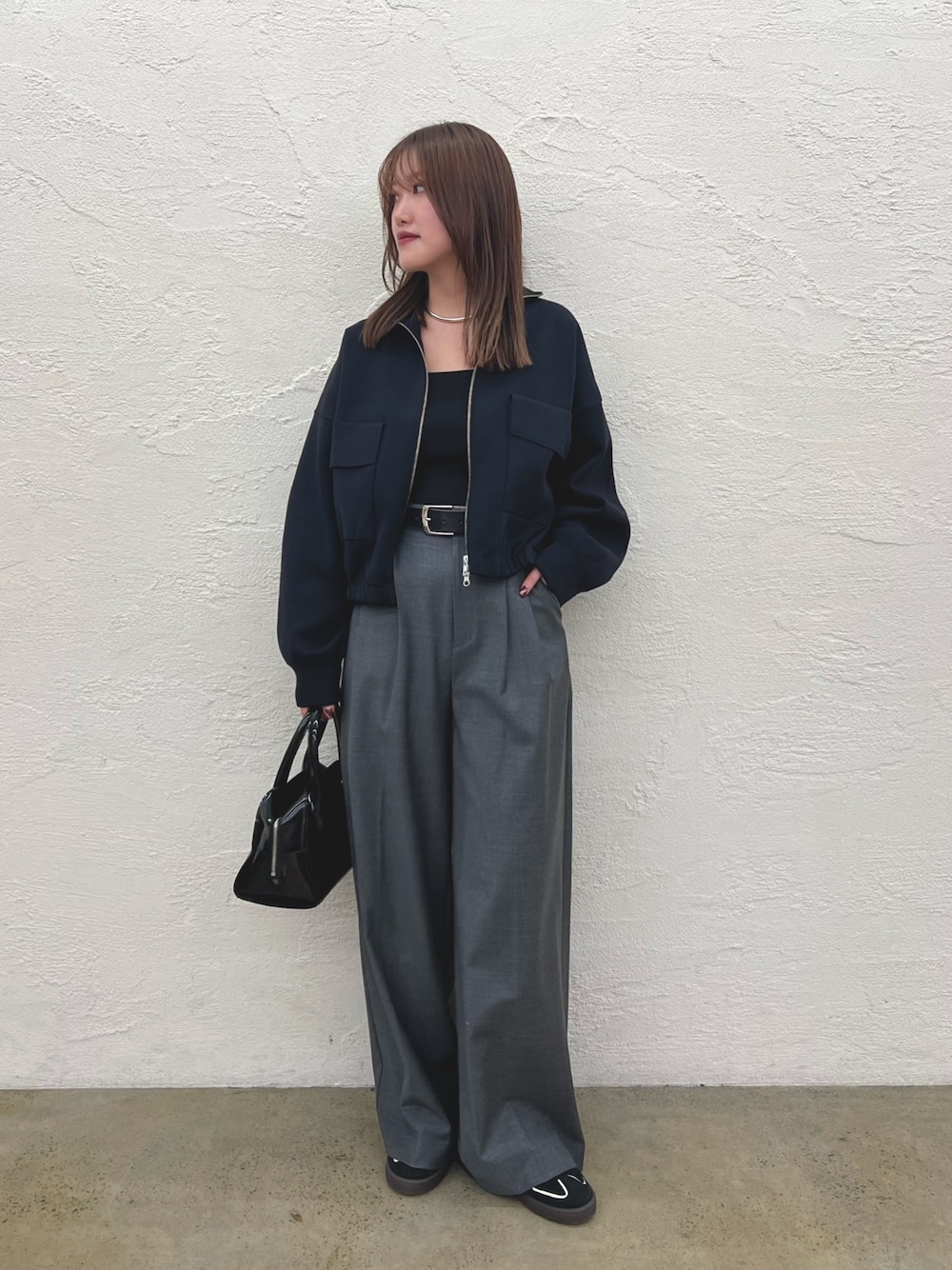 《tops》 ニット素材のジップブルゾン。ハリのある生地感でカジュアルになりすぎず着用いただけます。ボトムやインナーによって様々な着こなしが楽しめます。 《pants》着用38サイズ 綺麗なシルエットが人気のセンタープレスパンツ。ウエストのタックと光沢感ある素材です。身長に合わせてサイズが選べるのも嬉しいポイントです!