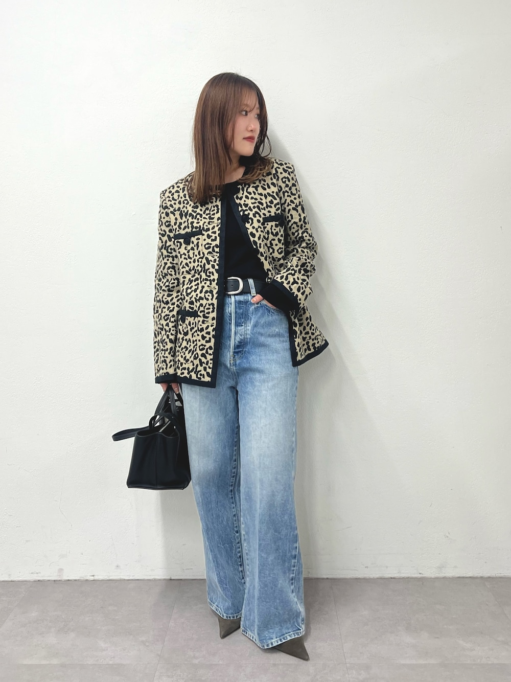《jacket》 リネンのノーカラージャケット。大きすぎないサイズ感ですっきりと着られます。レオパード柄やパイピングの配色がアクセントな一枚です。 《pants》着用38サイズ 程よいサイズ感と柔らかさのストレートデニムパンツ。センタープレスが上品見えを叶えます。シンプルで着回しの効くアイテムです。