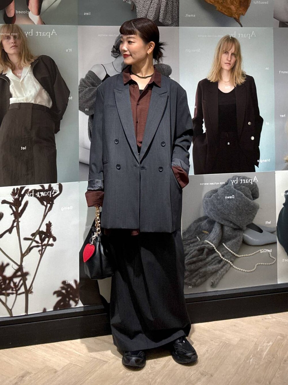 【ジャケット】Lサイズ Bigシルエットジャケット! ボタンはシンプル。チャコールグレーはシックでかっこいい印象になります!肩パッドが入っているのでカチっと感も出ます! 【ボトム】Mサイズ ラップ風デザインのスカート! 後ろにはスリットが入っているので足捌き◎