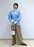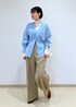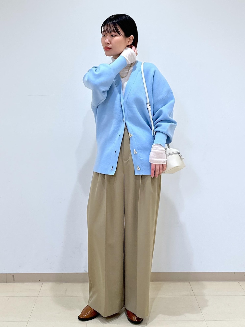 ゴールドのトライアングルボタンがポイントになる、肌触り抜群のカーディガンが入荷しております。 今回はサックスブルーをスタイリングしてみました。 サックスとベージュは相性抜群です! 色物ではありますが、色味もマイルドで印象が強くなりすぎません。 デニムやスカートとも相性抜群ですので是非お試しください♪