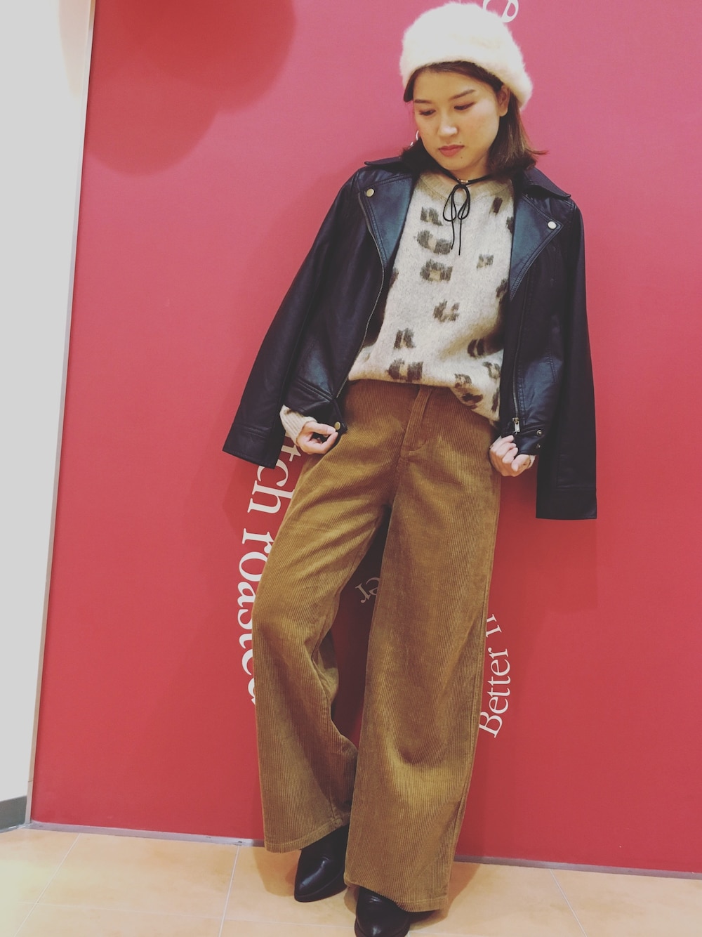 ヒョウ柄ニットとワイドパンツの同系色コーデにライダースでメリハリをつけました🐯