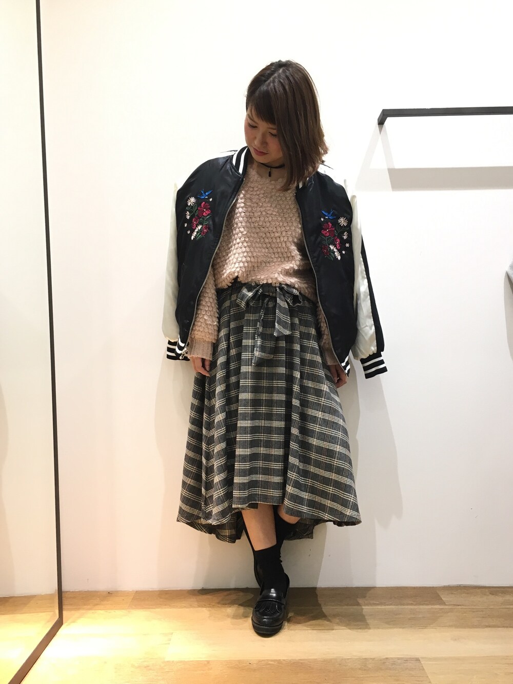 大人気だったリバブルゾン! そしてチェックのアシメスカートとピンクのループニットのコーデです! ブルゾンで甘すぎないコーデに💕