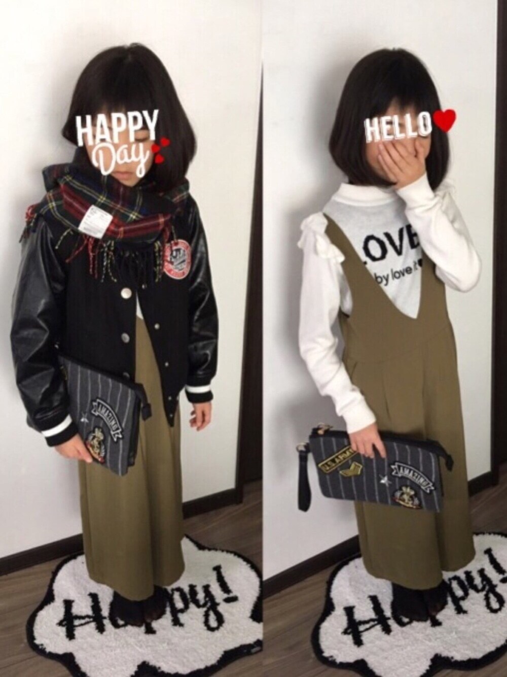 ご覧頂きありがとうございます😊 次は長女、リンクコーデ出来そうなカーキのオールインワンがお気に入り❤️ ヘビロテのスタジャンとSALEで激安でGETしたクラッチを合わせていつもより大人っぽいコーデの出来上がり😋
