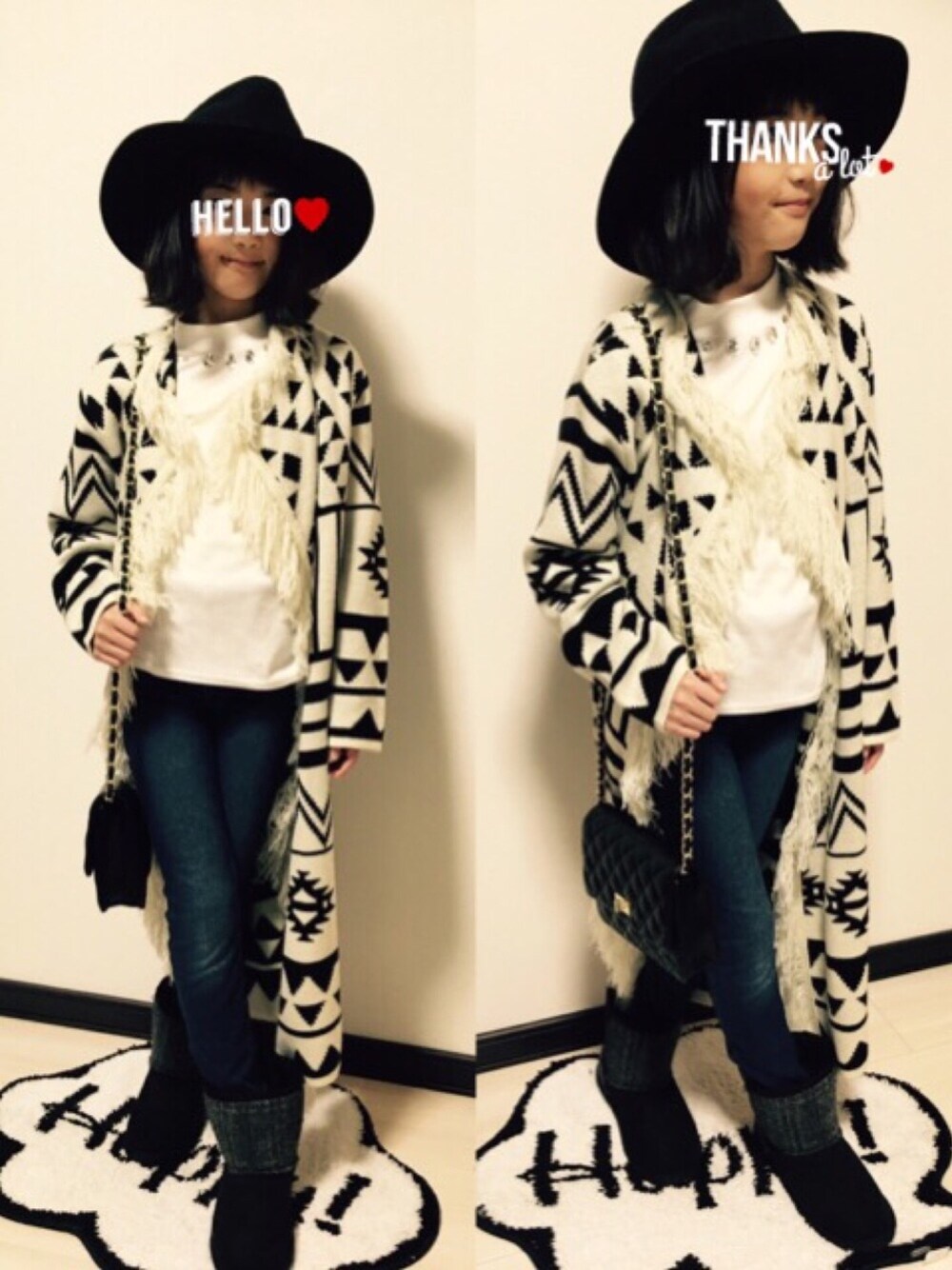 ご覧頂きありがとうございます😋 また、イイね♡save♡followして頂けてとても嬉しいです💕本当にありがとうございますm(_ _)m もう夜ですが朝の続きで長女のコーデ🙈 こちらもネイティヴ柄でお気に入りのカーディガンだけポイントでシンプルな感じです、小物はママのハットとバック👠 背伸びコーデでるんるんしてお出掛けしてました😆 残念ながら頭が小さく被っては歩けないのでハットは撮影時のみの飾りでしたが、、、笑 子供用のハットが欲しいなーーーと思います! 靴もホントはブーツ合わせたかったけど、妹と弟とお揃いで買ったハリスのシープしかなった事に気付きました😣ブーツも欲しいなーーーと思いました!