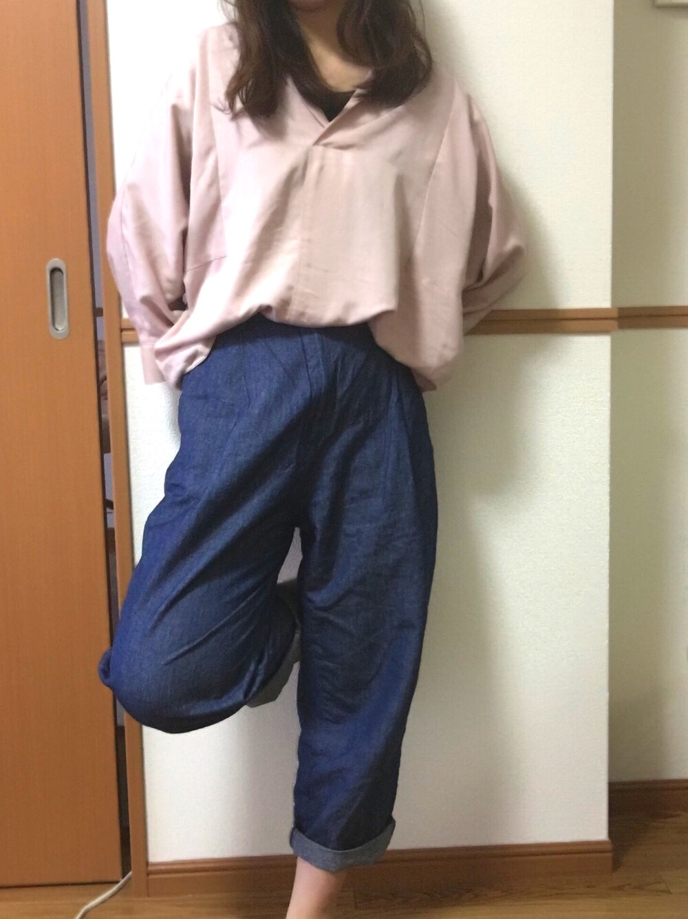仕事着。 急に薄着になった(・∀・) ブラウスもテロテロ 袖も長すぎず短すぎず、くすんだピンクで買ってよかった( ´﹀` ) パンツはGU。だぼだぼ(*´∀`*)
