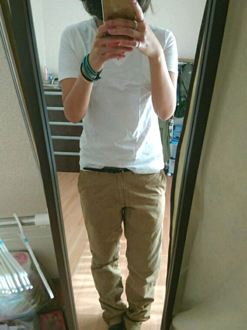 ホワイト系のTシャツ/カットソー、ベージュ系のチノパンツを着用したレディースの春コーディネートの1枚目の写真