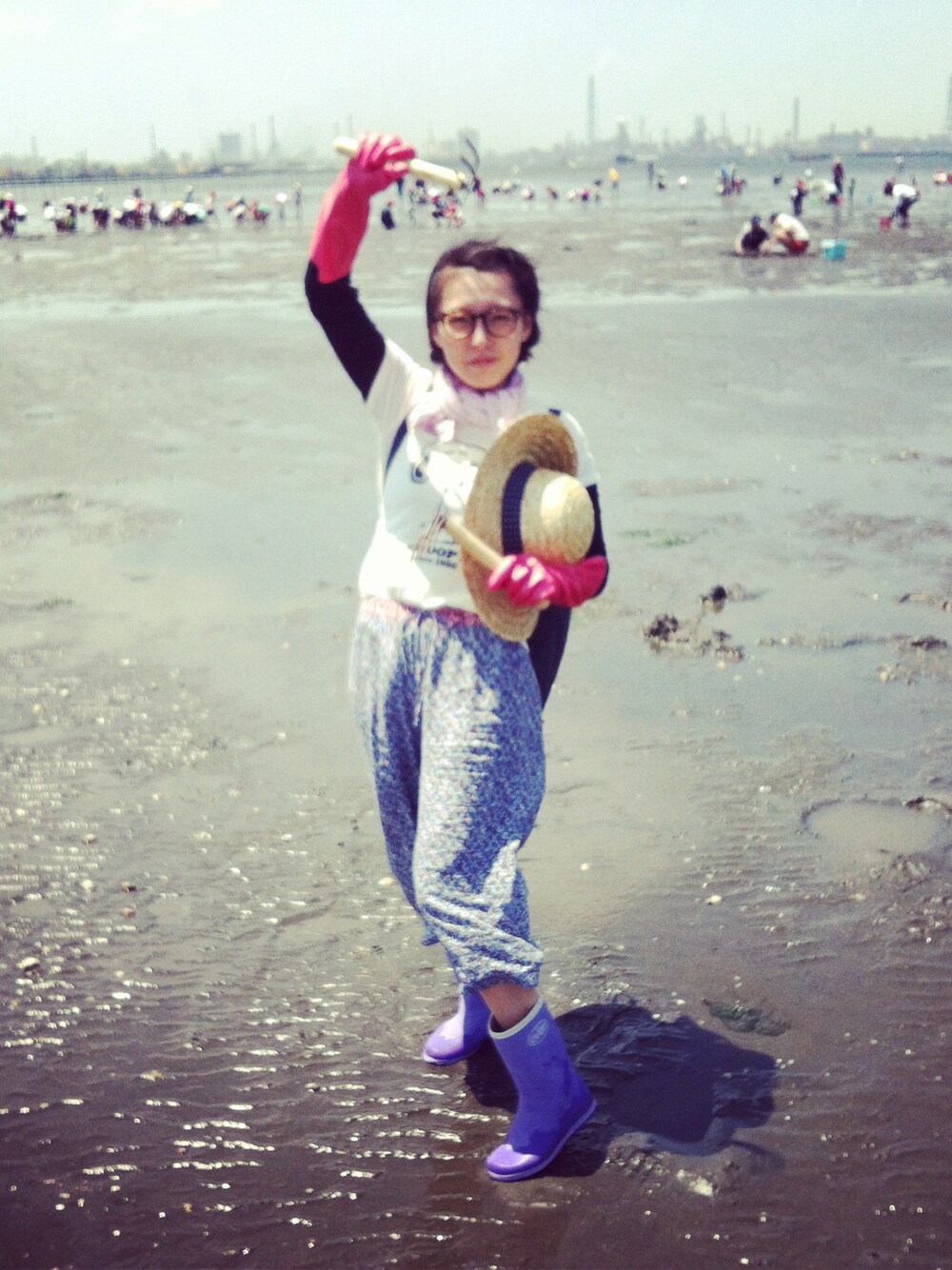 潮干狩り 帽子…ダイソー 首に巻いたタオル…借り物 Tシャツ ボトムス…UNIQLO 手袋…コンビニ 長靴 熊手…レンタル