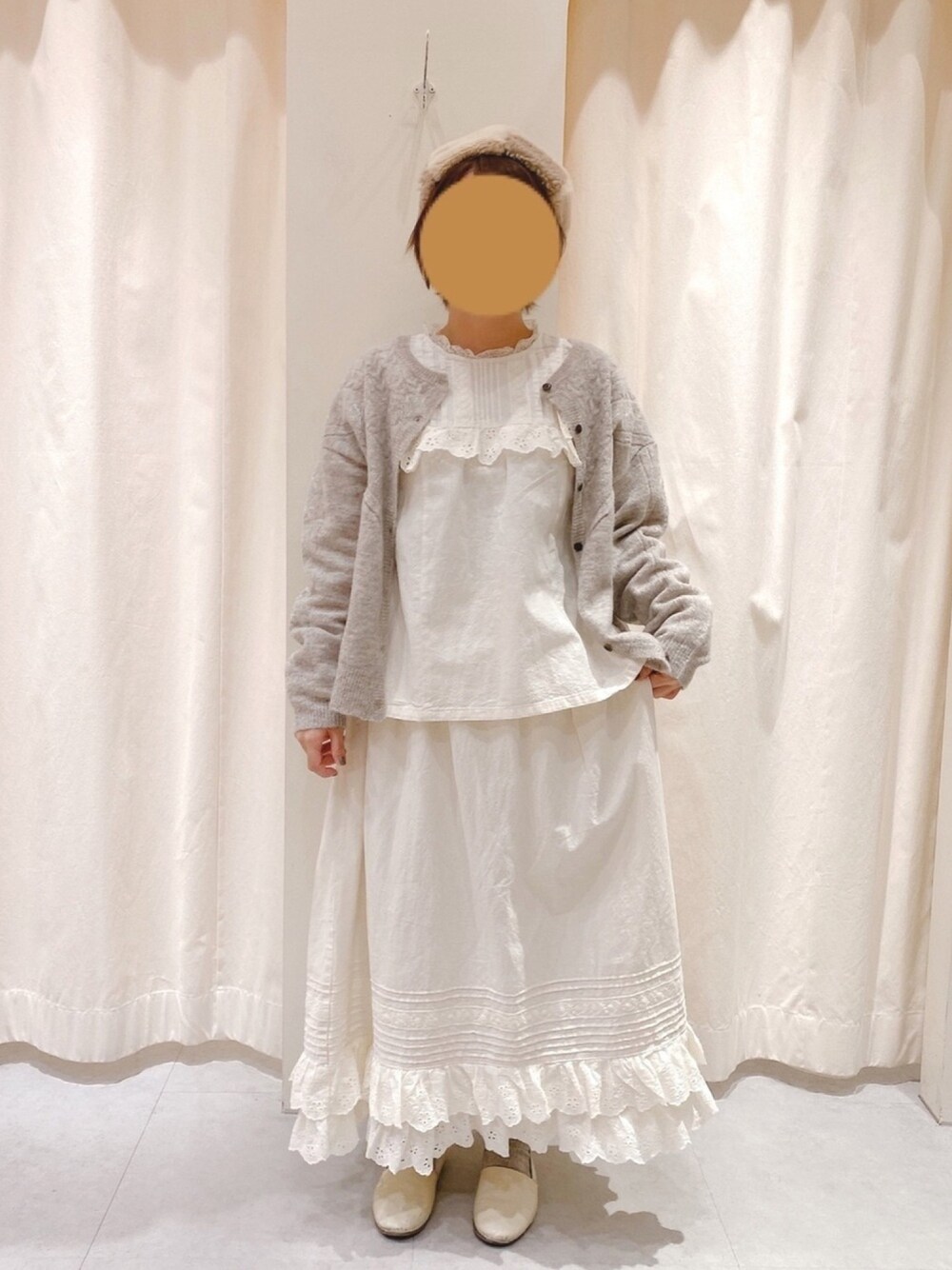 おはようございます! カタログ掲載の商品でのコーディネートです🎶 お店のスタッフにコーディネートしていただきました🌷 ブラウスとスカートはレースが 可愛いだけでなく 生地もしっかりしているので 冬もあたたかく着れます🌟