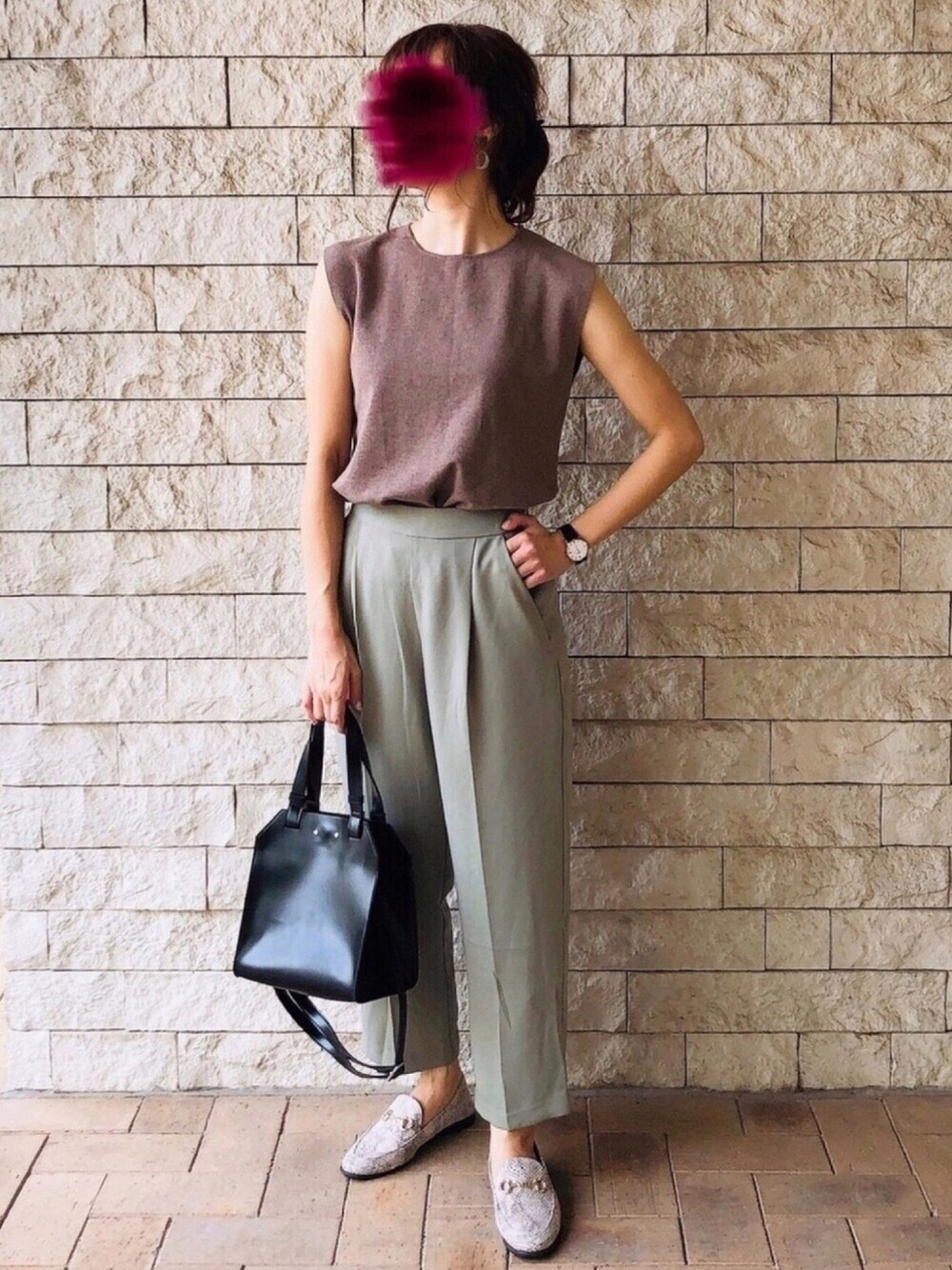 ブラウン×グリーンコーデ。 ヘタするとリアル「木!」って感じになって違和感を感じるのは私だけ?? 何度かの失敗を経て淡い色みで着地。 ノースリニット、季節的に今!