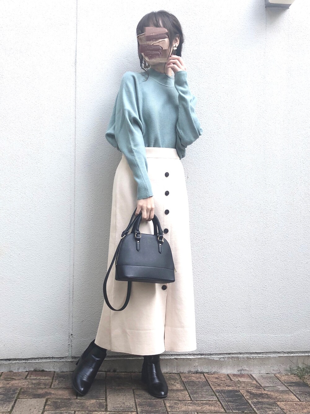 ご覧いただき、ありがとうございます。 前回コーデもフォルダin嬉しいです😆✨ ミント×白×黒 この色の組み合わせ好きすぎる😍 冬は白の分量多いコーデだとかわいさ増す法則☺️ 大人のデートコーデに❤️ 上下ニットのやわらかい素材感も◎ スカートボタンの縦ラインのおかげで、 膨張しがちな白ニットスカートでも 細見えが叶う✨Iライン大事!