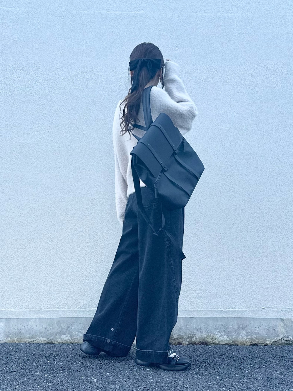 ブラックにふわふわカーデ🧸☁️ バックパックは以前大きいのを使ってたんだけど 今回ワンサイズ小さくしたので よりタウンユースに特化できていい感じです♥